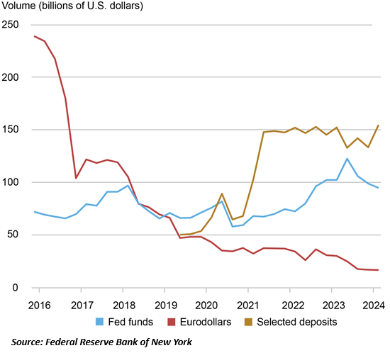 "Selected deposits are unsecured U.S. dollar deposits that also tend to have an overnight maturity, similar to Eurodollars. However, unlike Eurodollars, but like fed funds, selected deposits are booked at bank offices in the U.S."