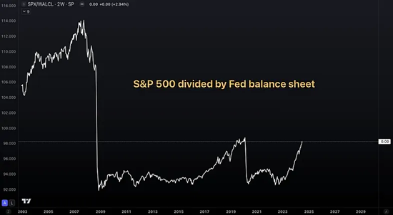 This chart shows the SPX stock index divided by the Fed balance sheet: