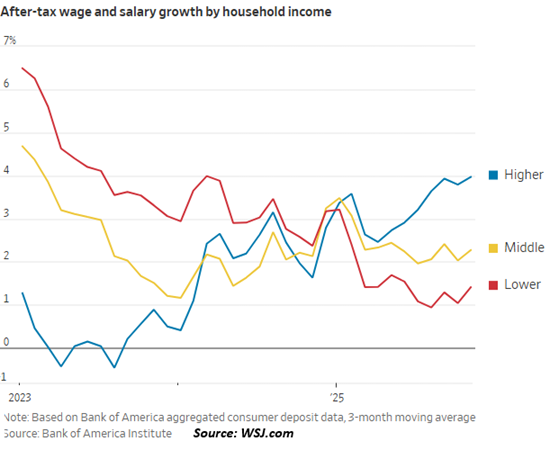 Wage growth mirrors this asymmetric distribution: the post-pandemic stimulus trillions that boosted the mid and lower income workforce has reversed while wages for the top tier are rising.